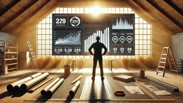 A roofing contractor stands before an overwhelming wall of metrics — capturing the reality of chasing Angi leads, spending time reacting instead of growing the business.
